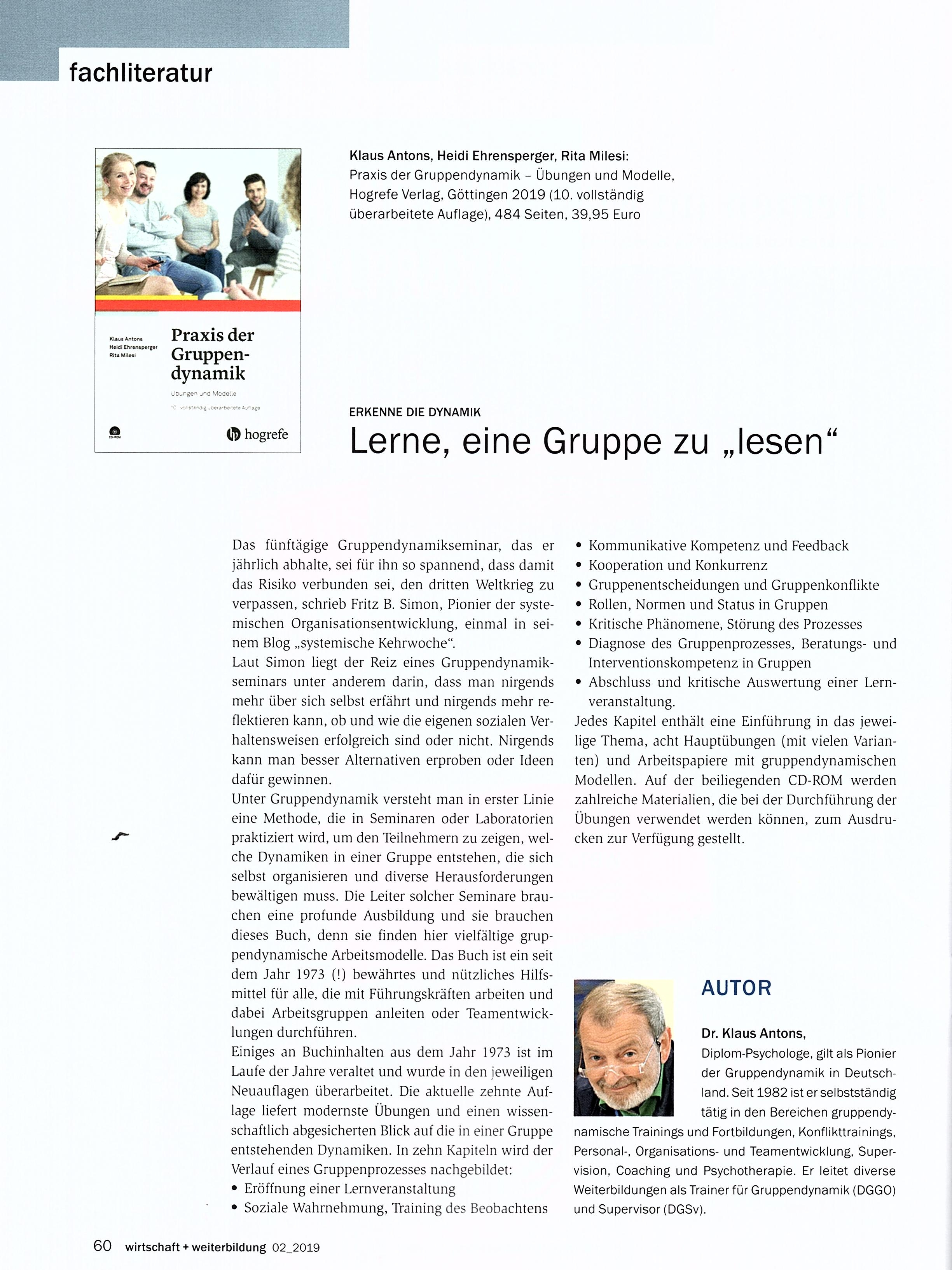 Praxis der Gruppendynamik Veröffentlicht am 26. Dezember 2015 von klaus Der Klassiker – in der 10. Auflage mit neuen Übungen und Modellen Rezensionen Lerne, eine Gruppe zu "lesen" Ein Dauerbrenner mit frischen Inhalten Klaus Antons, Heidi Ehrensperger, Rita Milesi Praxis EP 2019 3 V.Ineichen